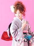 花柄と明るくやわらかい色使いの着物に、ふんわりキュートなヘアスタイルを合わせると女性らしさがバツグンに増します!トップにボリュームを持たせて大きく散らすことで、華やかさを演出できます。襟足におくれ毛を適度に出すことも忘れずに。可愛らしさが倍増します。髪飾りも明るい色の大きめなものを使えば、注目度アップ☆